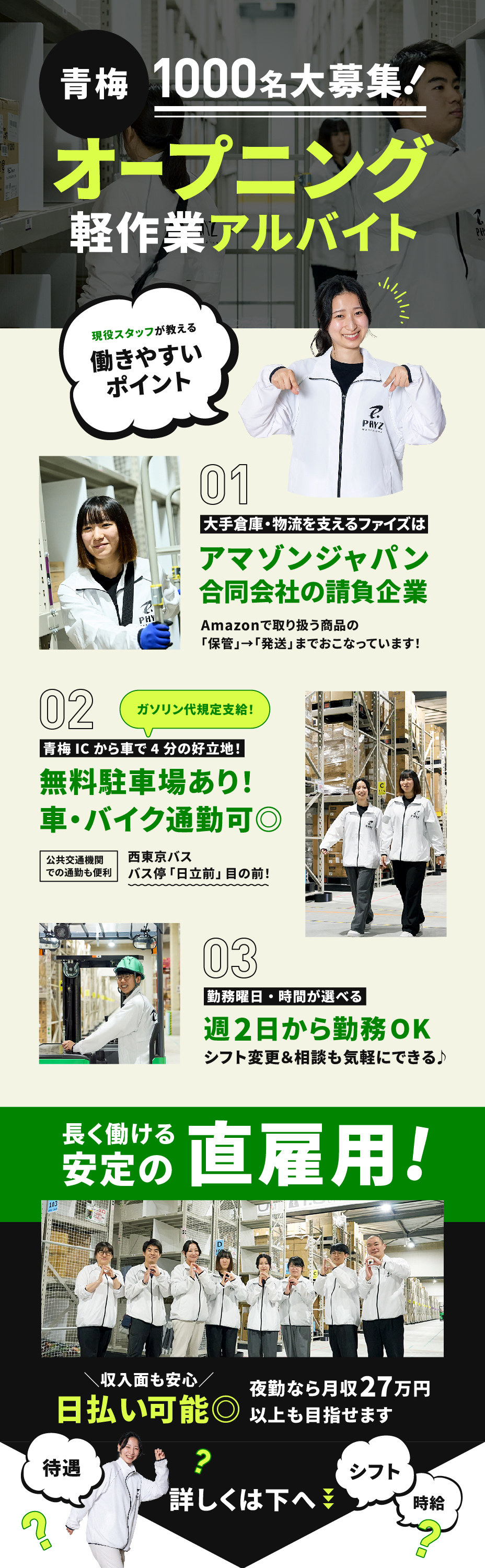 | 仕事内容 | ◆◇◆◇◆◇◆◇◆◇◆◇◆◇◆◇◆◇◆◇◆◇◆◇◆◇◆◇ ファイズオペレーションズ株式会社は アマゾンジャパン合同会社の請負事業を担っています。 Amazonで取り扱う、さまざまな商品の 保管から発送まで一連のプロセスを対応しています! ◆◇◆◇◆◇◆◇◆◇◆◇◆◇◆◇◆◇◆◇◆◇◆◇◆◇◆◇ 梱包などのシンプル軽作業をお任せします! 商品の棚入れ、検品、ピッキング、梱包、仕分け…… チームに分かれてお仕事を進めます! より詳しいお仕事内容や業務のコツは 入社後に丁寧に教えますので 未経験の方も遠慮なくご応募くださいね! <未経験大歓迎! 新規メンバー”1000名”大募集!> 充実した環境でお仕事できる今がチャンス! キレイな新倉庫で心機一転スタートしませんか? 直接雇用なので長期安定して勤務できます◎ シフトの融通性もバツグンで自分らしくお仕事できます! ★オススメポイント★ ✅ ピカピカの最新倉庫なので充実した環境 ✅ オープニングなのでみんな一緒のスタート ✅ 車通勤OK!無料駐車場完備!通いやすさ◎ ✅ バイク・自転車通勤もOK! ✅ 自動車通勤者にも交通費(ガソリン代)規定支給! ✅ 週2日~OK!シフト相談もできます!! ✅ 日払いは24h申請OK!ピンチの時も安心◎ ✅ カフェテリア完備で休憩時間も快適~! ✅ 交通費支給(1日2000円上限) <2025年3月にNEW OPEN!> 新しくオープンした最新物流倉庫! 綺麗な環境で働けます。 女性活躍中の職場です! 男女比は4:6で女性の方が多く活躍している職場です 困ったことやわからないことはスグに ご相談してくださいね! |