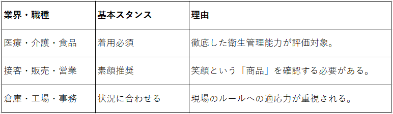 ※マスク着用のルールは企業や現場によって異なります。以下は一般的な傾向です。