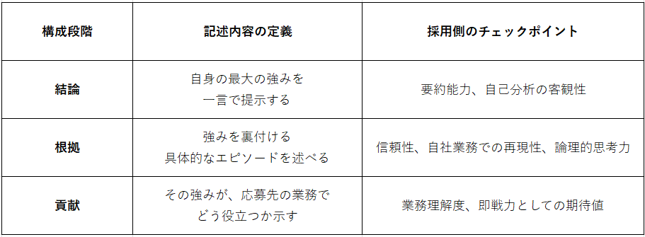 まずは、自己PRの基本的な構成を表で整理してみましょう。