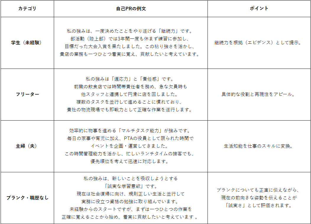 - 学生、主婦(夫)、フリーターなど状況別の自己PR例文